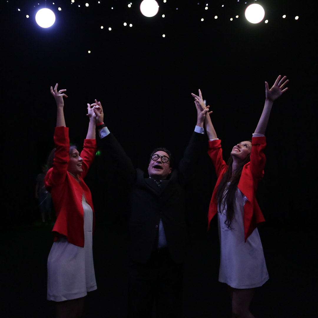 In a 20 x 20m space, we created a dark room with a canopy full of lights. Visitors could walk in in complete darkness and watch the lights appear slowly. In the center of the room there was a cluster of interactive light globes. Users could reach up for them and they would come down to their hands.